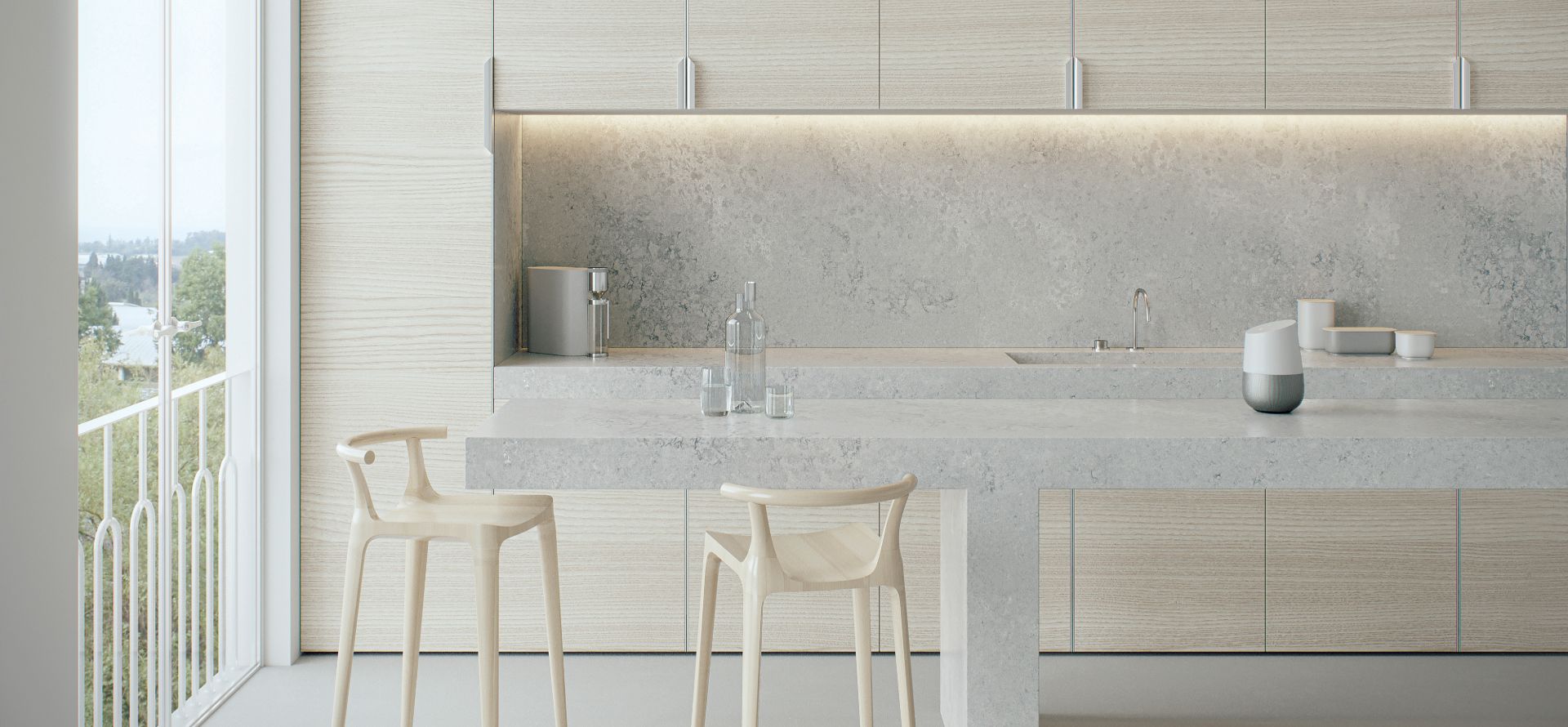 Airy Concrete (Rough) är en ljusgrå kvarts i Metropolitan-kollektionen som fångar känslan av äkta betong i full rörelse. Ytan virvlar med moln av mörkare nyanser och vita blixtar över den djupt texturerade strukturen som är förfinad för hemmet.