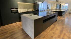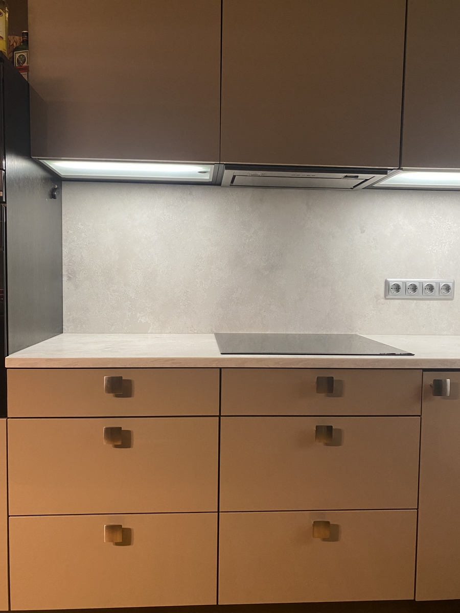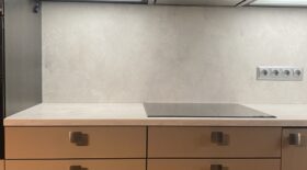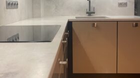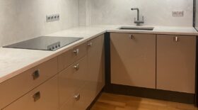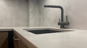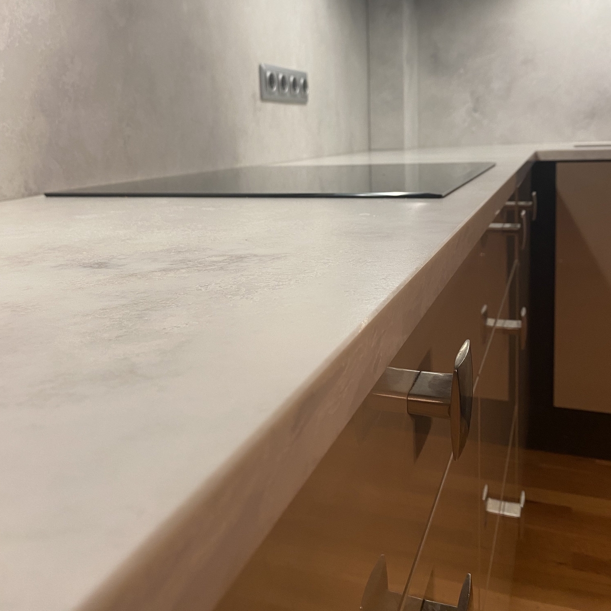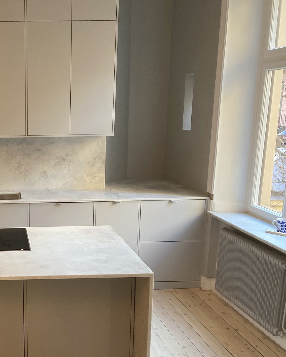 Kompositstenskivor i Ambiente Light material är starka, hållbara och extremt hygienisk! Den grå färgen ger köket en modern och lugn bakgrund och förhöjer alla andra föremåls djärvare färger.