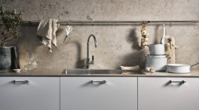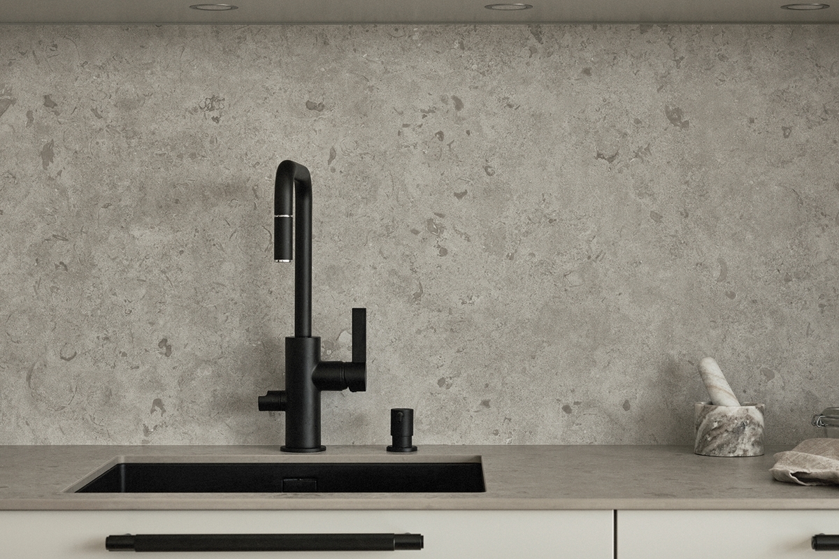 Norrvange Light Grey är en keramisk bänkskiva med matt yta, rik variation med fosiliknande och naturliga detaljer.
