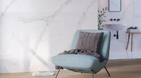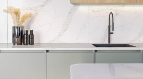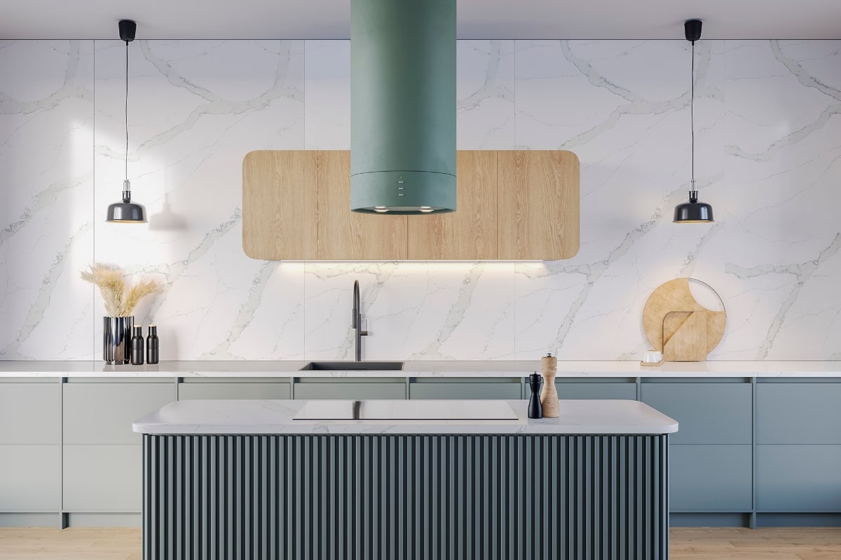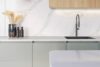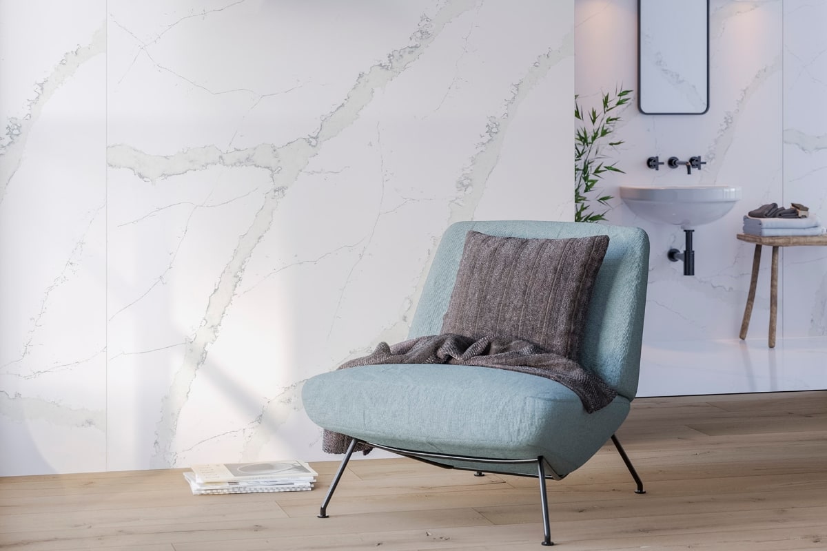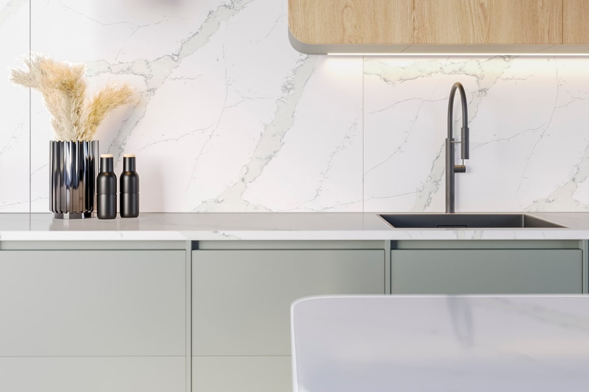 En kvartssten vars mönster påminner om de sprickor som bildas i is. Dessa tillför dynamik och karaktär till den vita stenen. Passar utomordentligt i ett kök, där man använder grå eller svart vask och blandare.