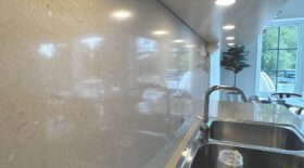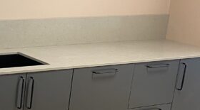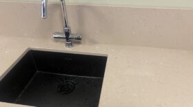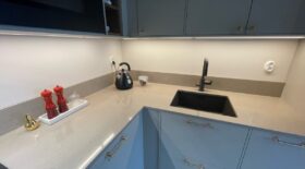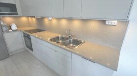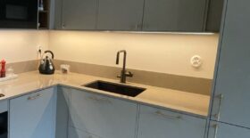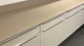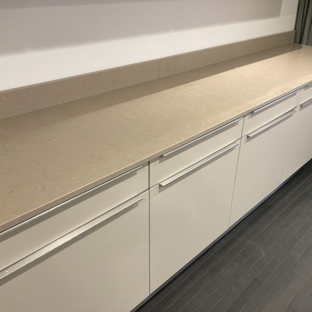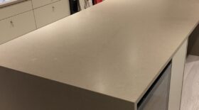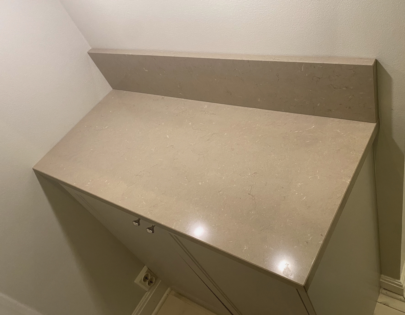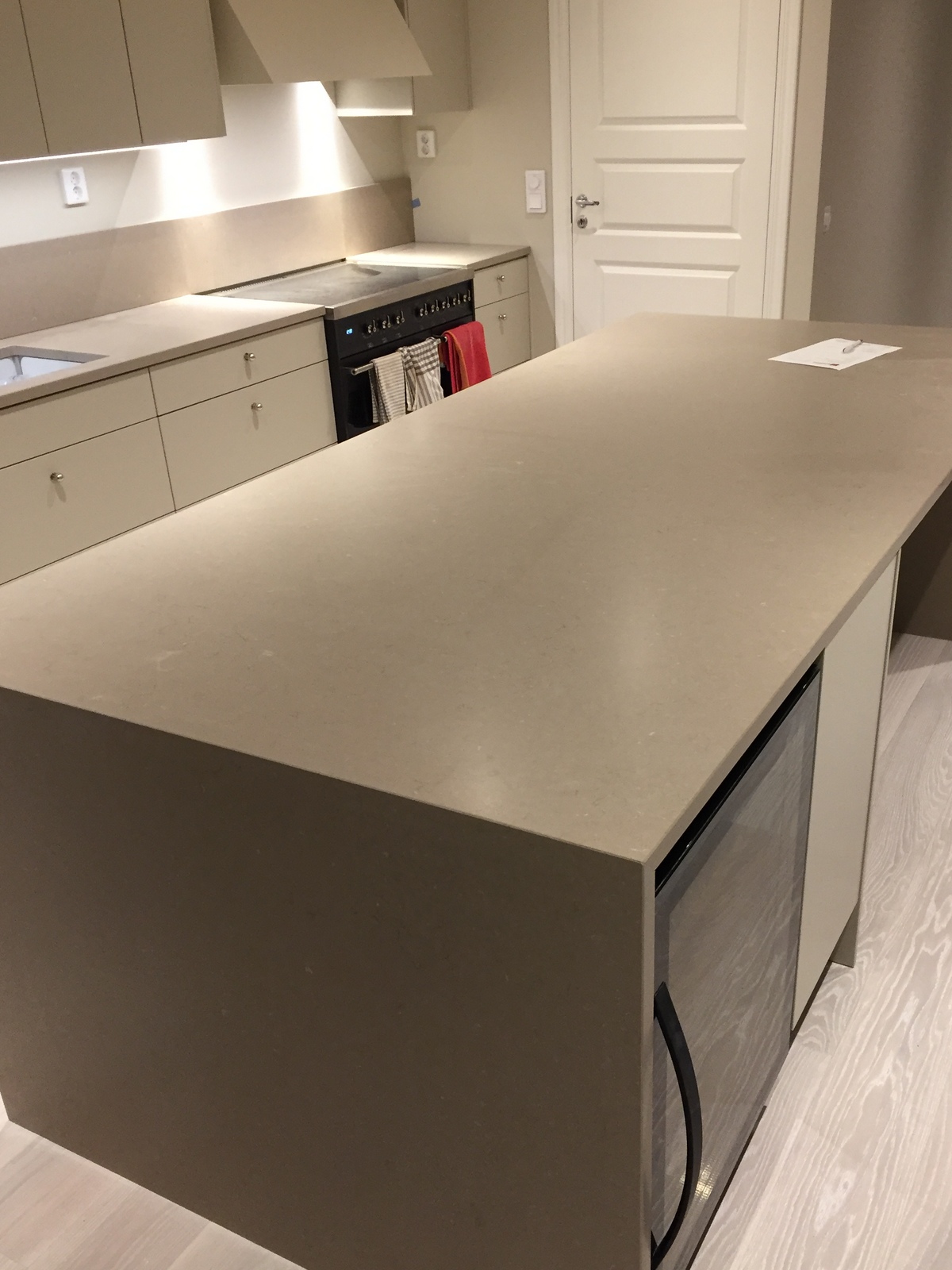 Coral Clay är kalkstenliknande kompositsten. Kvartssten, även känd som konststen, är – som namnet antyder – gjord av människan. Dess fördelar är oföränderlig och enhetlig färg och bra tekniska egenskaper – kompositsten är starkt, resistent och icke-poröst. Detta gör kvartssten mycket hygieniskt. Kompositstenskivor består av över 90 % naturlig sten, resten är lim, färg och tillsatser för att förbättra de tekniska egenskaperna. En bänkskiva i kompositsten är ett konstverk!