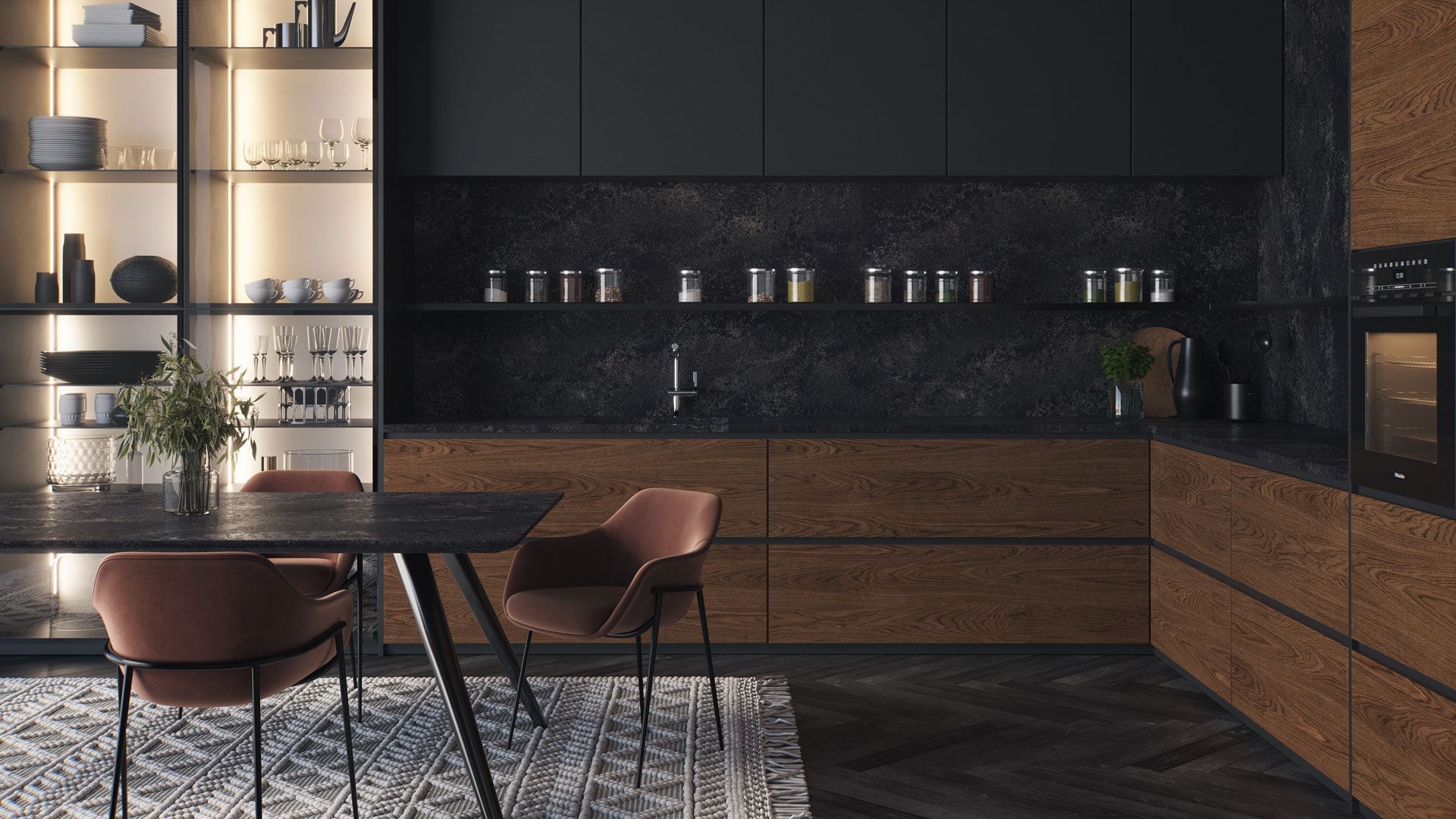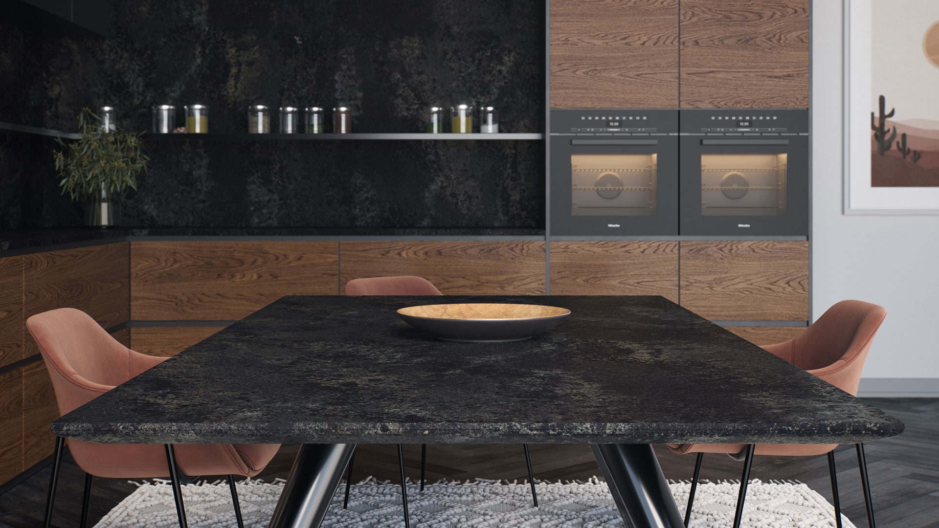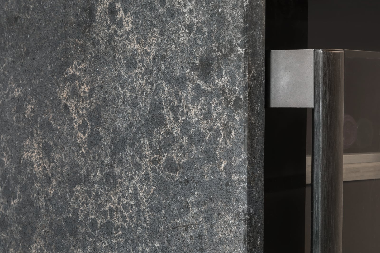 Darcrest är kvartsstenen in Supernatural-kollektionen. Över en hemlighetsfullt förtrollad mörk bakgrund läggs fläckar och sediment. Med en organisk ockrabrun och jordartad grön slöja ser den ut som en eroderad stenig bergsluttning.