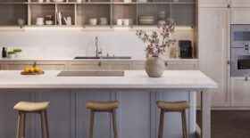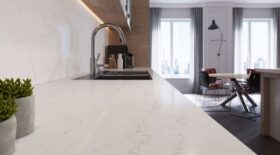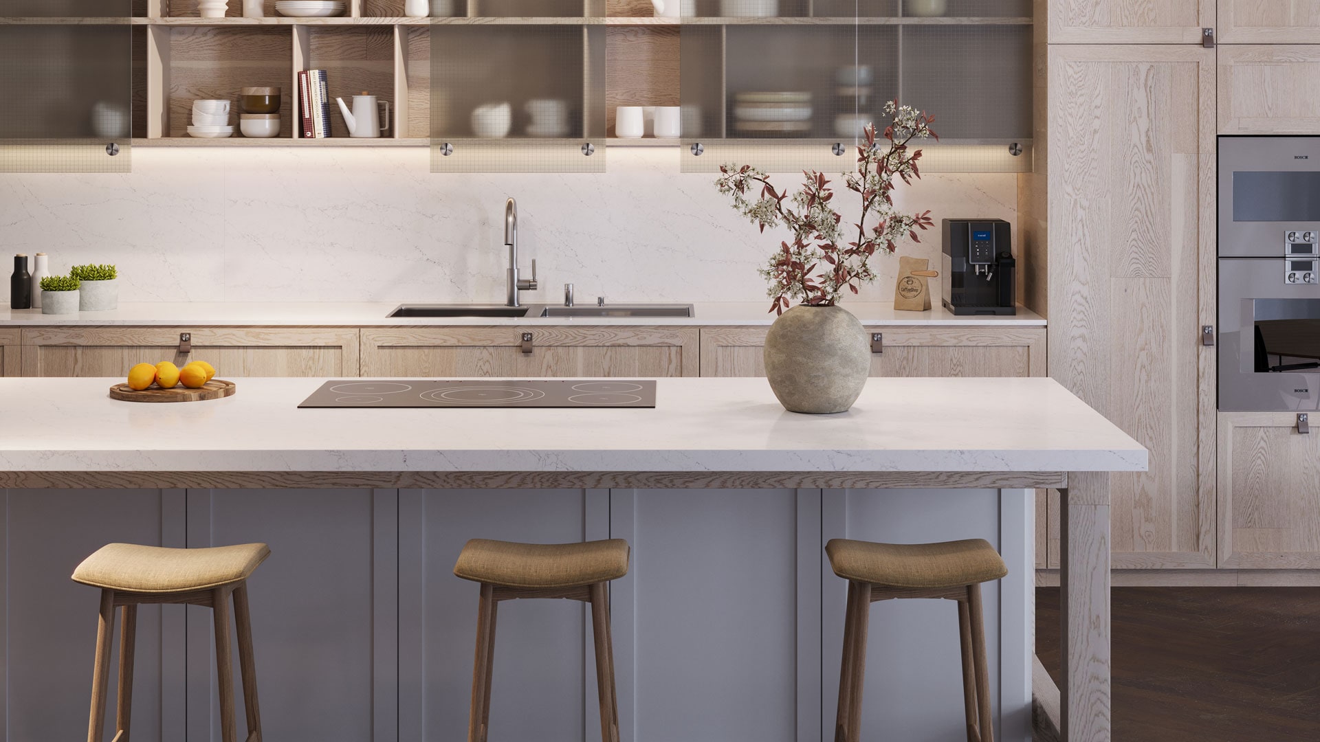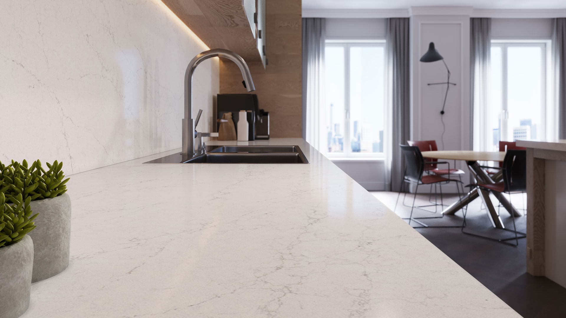 Dreamy Carrara (H-honed) är en ytbehandlad kvartssten i Supernatural-kollektionen, inspirerad av den berömda Carraramarmorn. Skiftande fina blåtonade och ljusgrå linjer slingrar sig mot en sidenvit bakgrund. Mönstret symboliserar rörelse, stelnad i ett ögonblick.