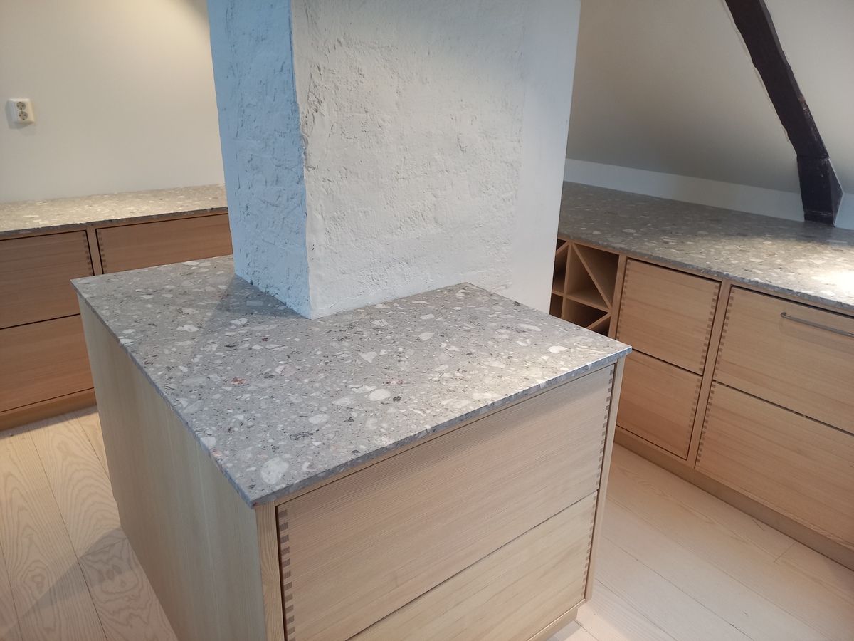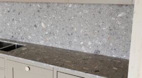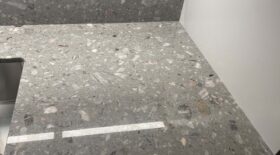Terrazzo Fior Di Pesco är en grå konstgjord sten, terrazzo tillverkad av flisor av natursten, där harts har använts som bindemedel.