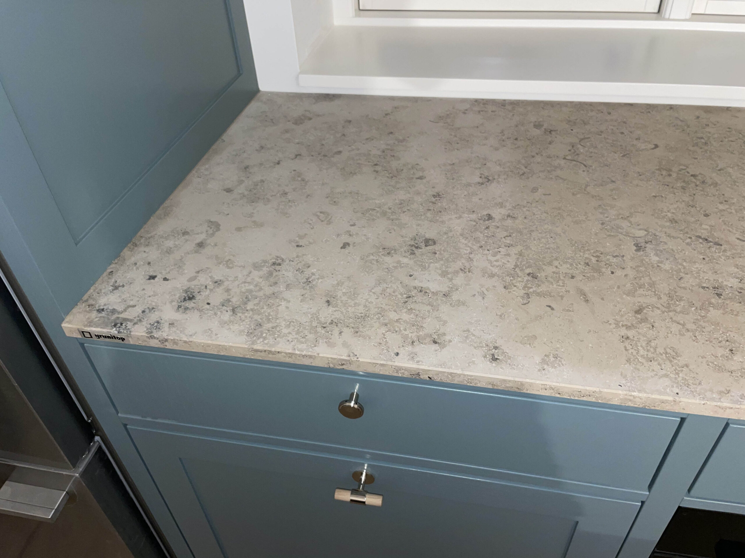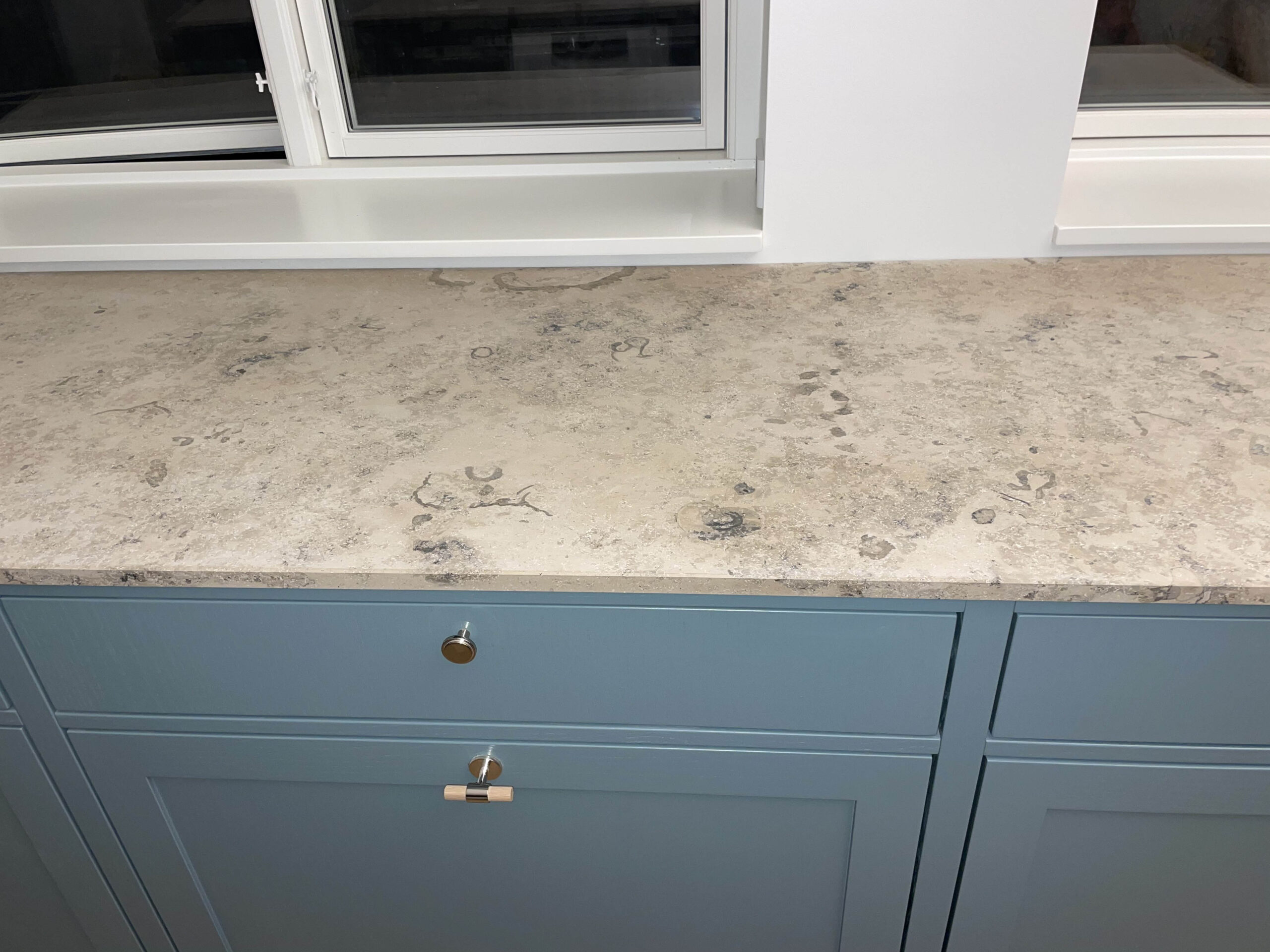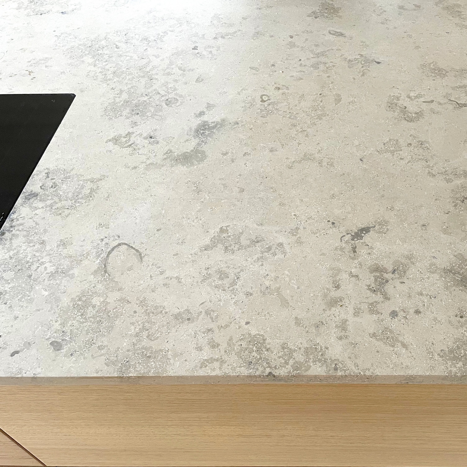 Jura Grey är en tysk kalksten med ljus bakgrund och vacker mönster. Det är inte ovanligt med fossiler som smyckar stenens beigegrå bakgrund.