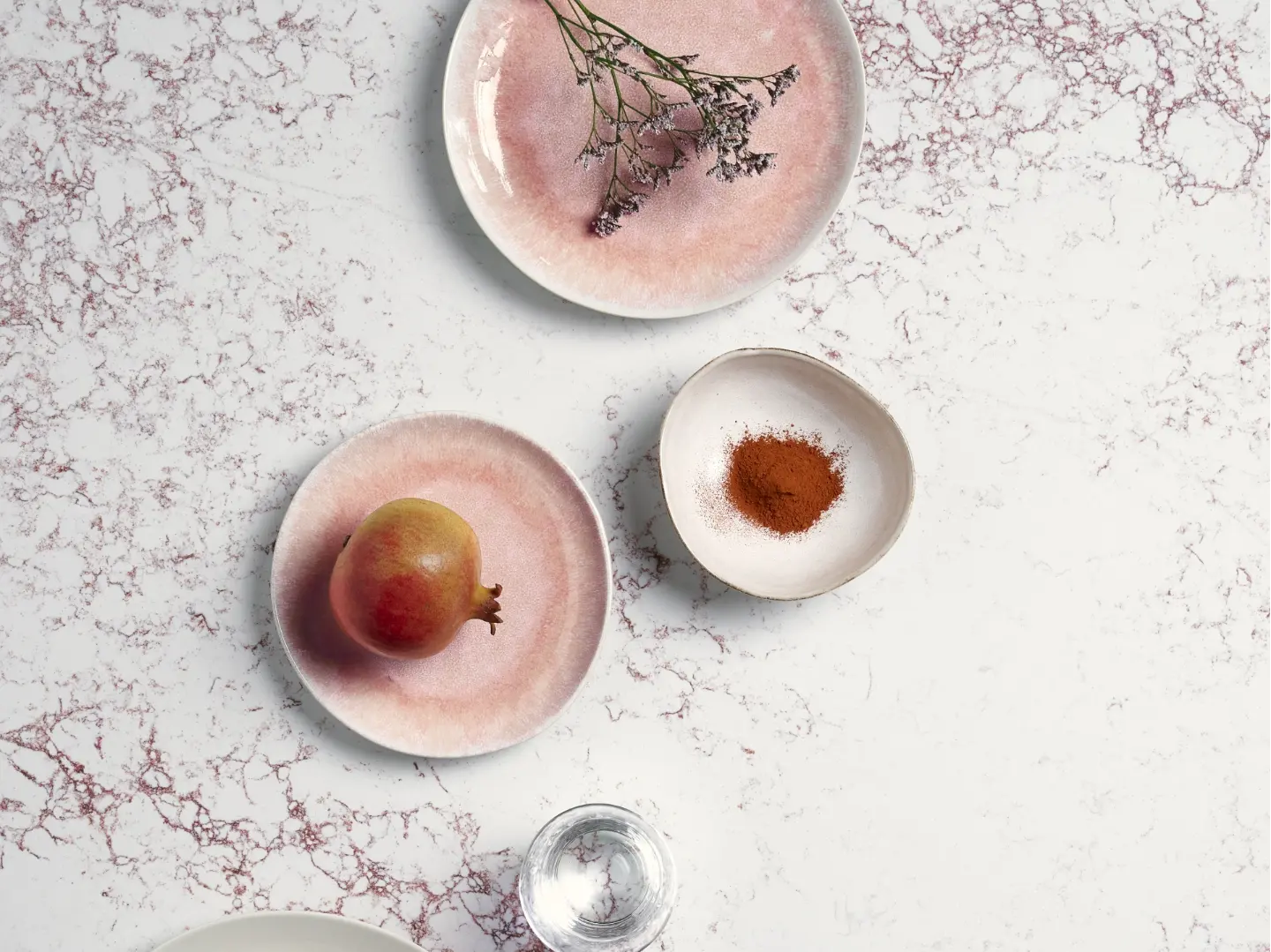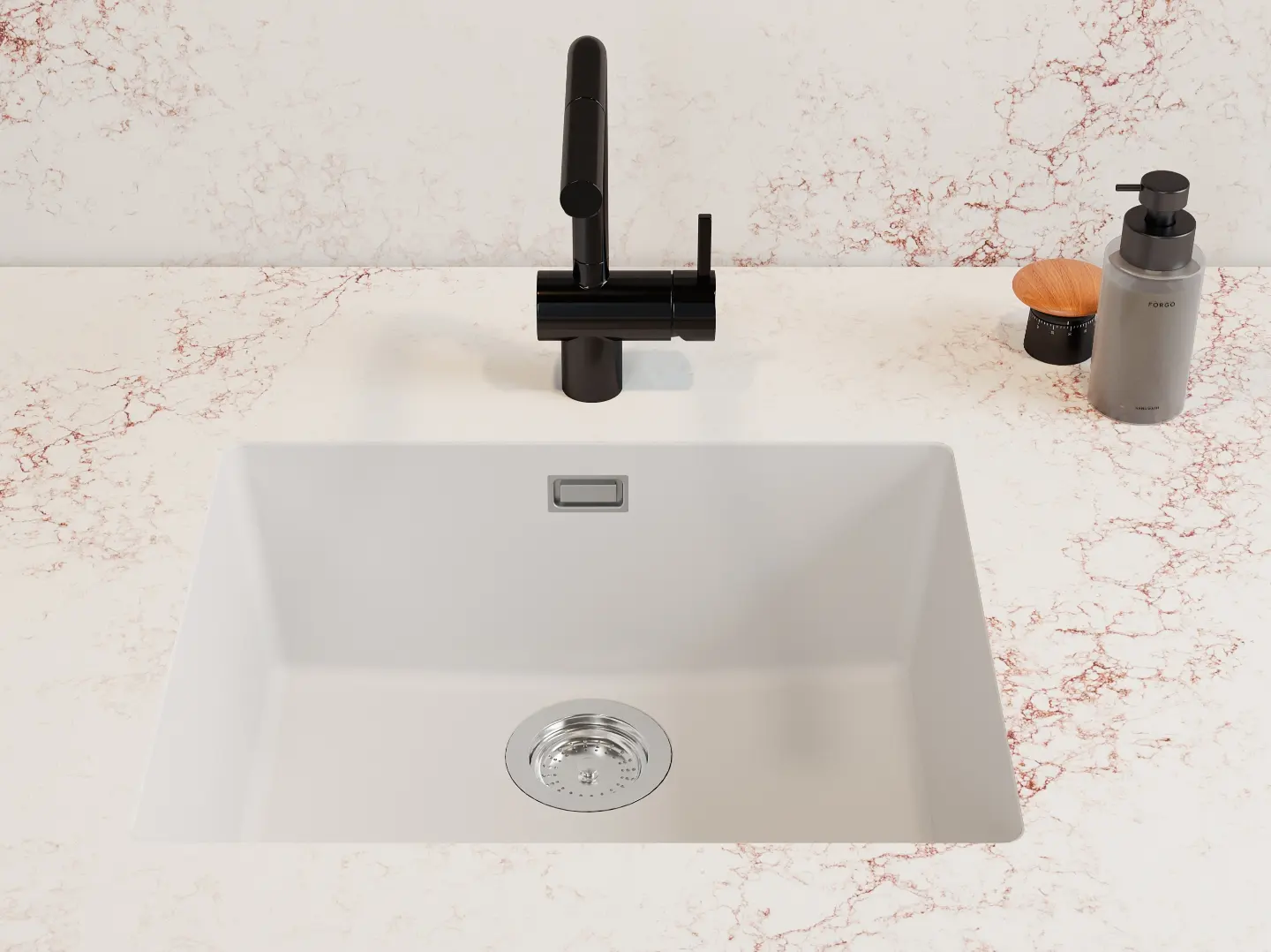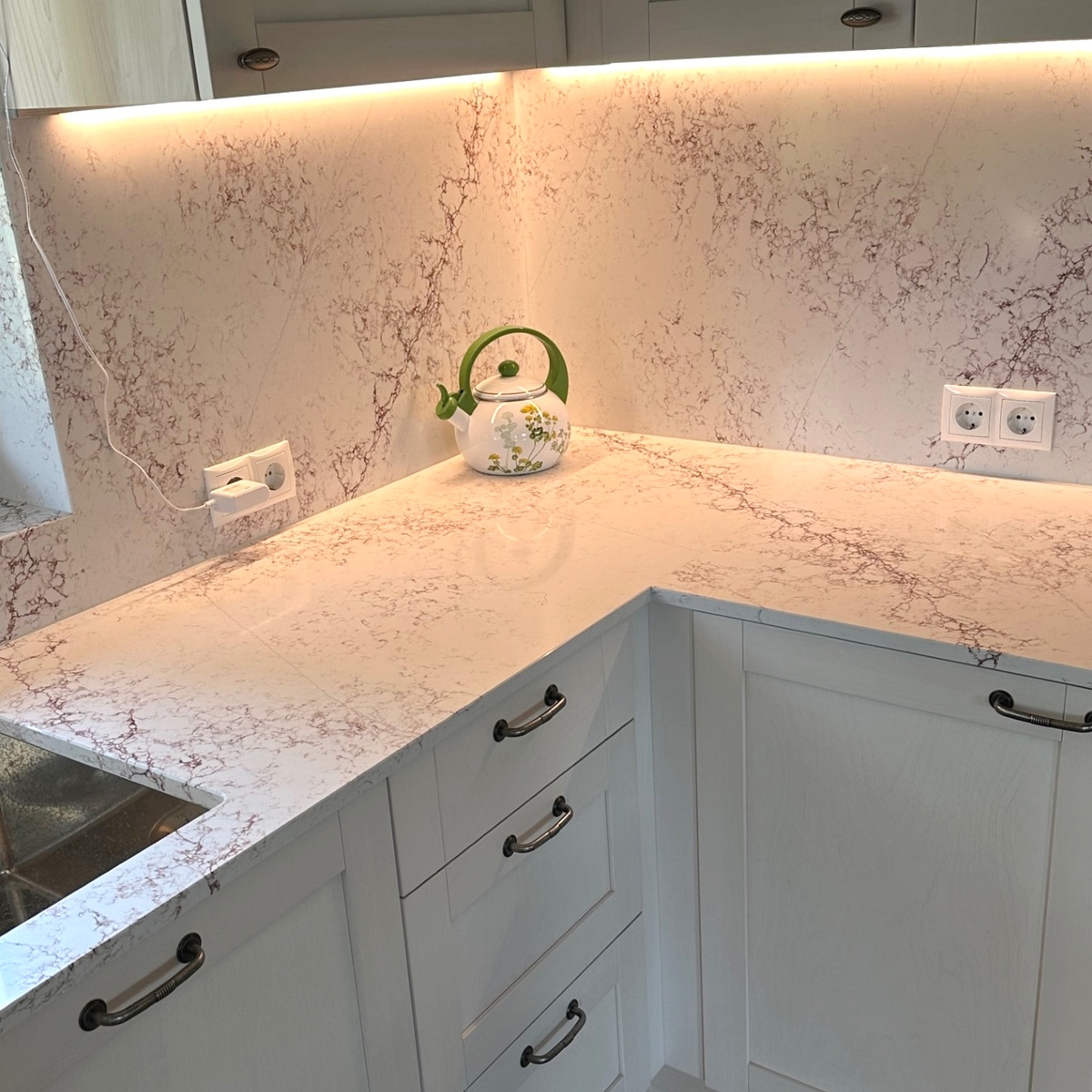 När man utformade denna kvartssten har man använt ren kvarts, strukturell polyesterharts samt UV-ljuståliga färgpigment. På det sättet har man fått en sten, jämnt tonad i vitt, vars mörkröda strängar i ytan och guldskimrande ljusgrå trådar ger ett spännande och medryckande intryck.