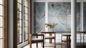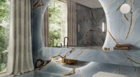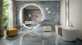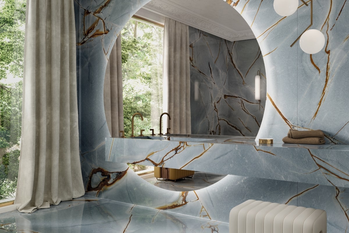 Porcelanosa Blue Roma – en keramik med ett ögonfägnande mönster, som andas styrka och hållbarhet. Bronsfärgade linjer har tecknats på Blue Romas yta och liknar kvartsit med samma namn som finns naturlig. Blue Roma med sitt smakfulla och naturliga ytmönster är som ett konstverk som livar upp varje bostads- eller affärslokal.