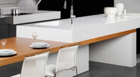 Pure White-stenen i Classico-kollektionen är det ljusaste materialet i Caesarstones utbud. Den vita stenen drar inte särskilt mycket uppmärksamhet till arbetsytan, men den ger ett fräscht intryck och rummet får en öppen känsla.