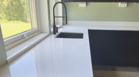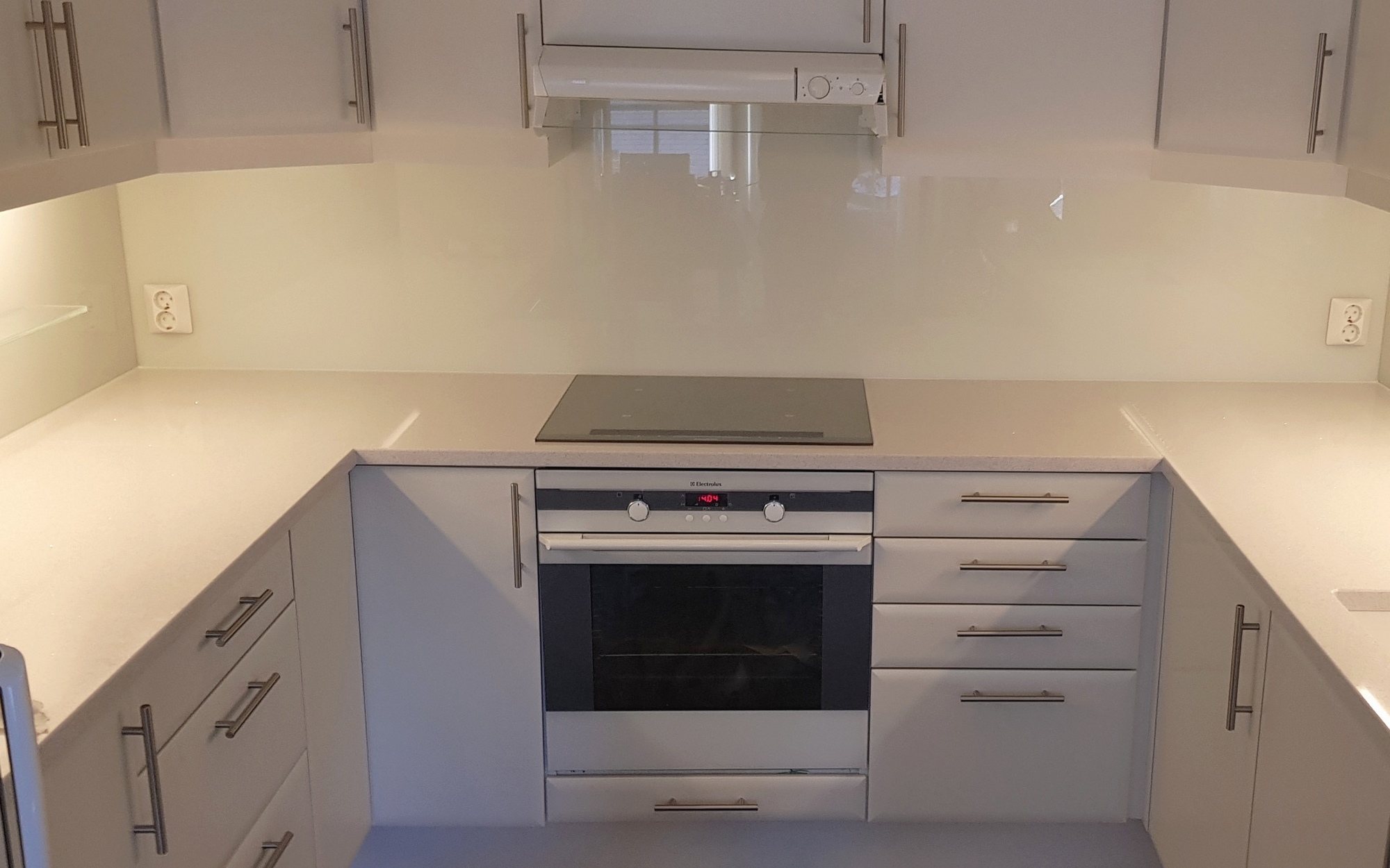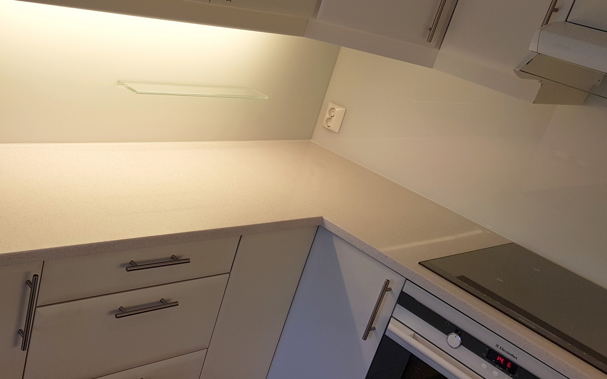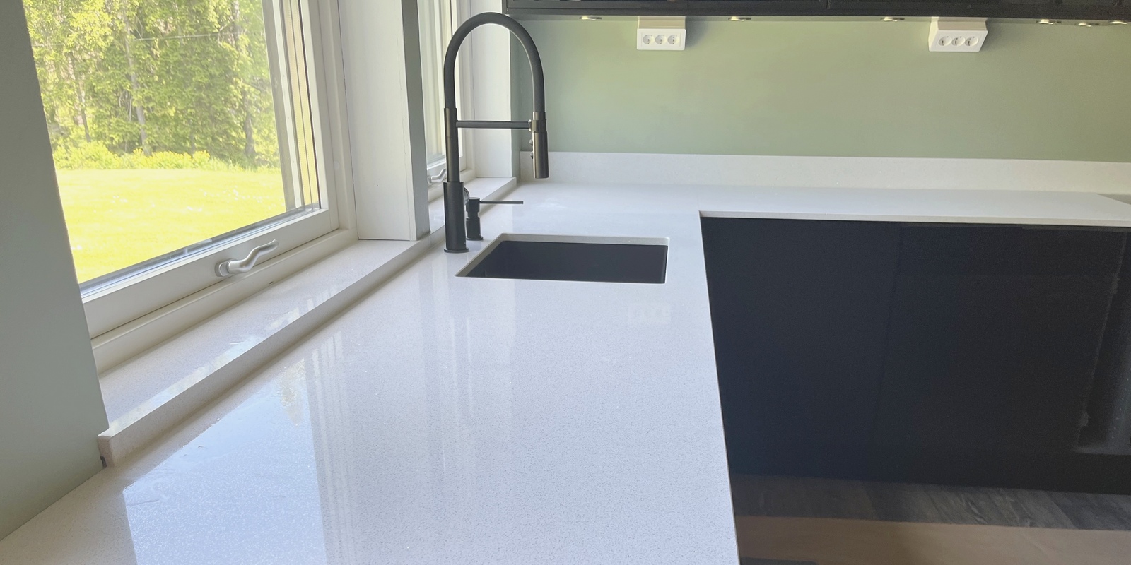 Starlight White är en ljus kompositsten med spegelgranulat och andra kristaller. Det är nästan vit, med kristaller i andra toner för extra personlighet – precis som salt mat med lite socker för att få fram smaken. En bänkskiva i kompositsten är ett konstverk!