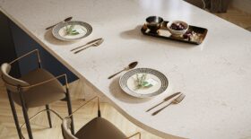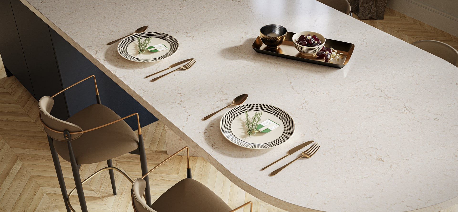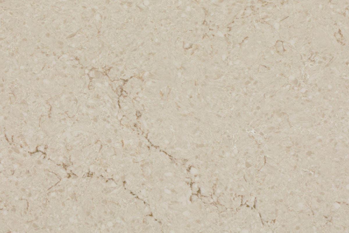 Taj Royale är en mjukt beigeaktig kvarts som påminner om kalksten. Mot en kaffe-med-mjölkfärgad bakgrund möts varma och naturfärgade toner – bruntonade slingor och linjer tillsammans med ljusbeige och vita prickar och fläckar.