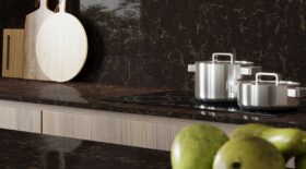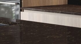 Woodlands är en naturlig kvarts i Supernatural-kollektionen och den påminner om mörkare marmor. Mot dess chokladfärgade bakgrund dansar ljusa, fint tecknade ådror.