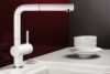 Urvalet av blandare inkluderar duschhuvud (bokstaven S i produktnamnet), blandare som kan sänkas ner i bänkskivan (F) och blandare med diskmaskinskran (A). För ett ännu mer elegant resultat föreslår vi tvålpumpar som integreras i bänkskivan och som kan användas för lagring av diskmedel eller flytande tvål.